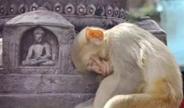 一只猴子靠在佛龛前