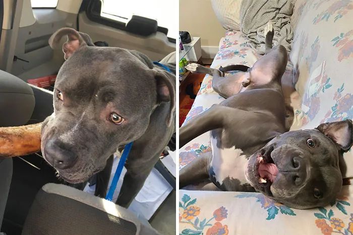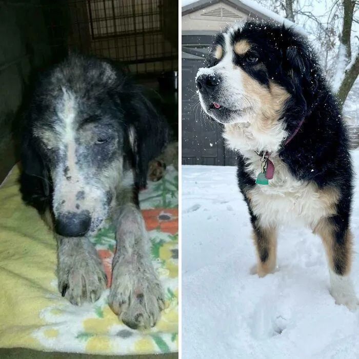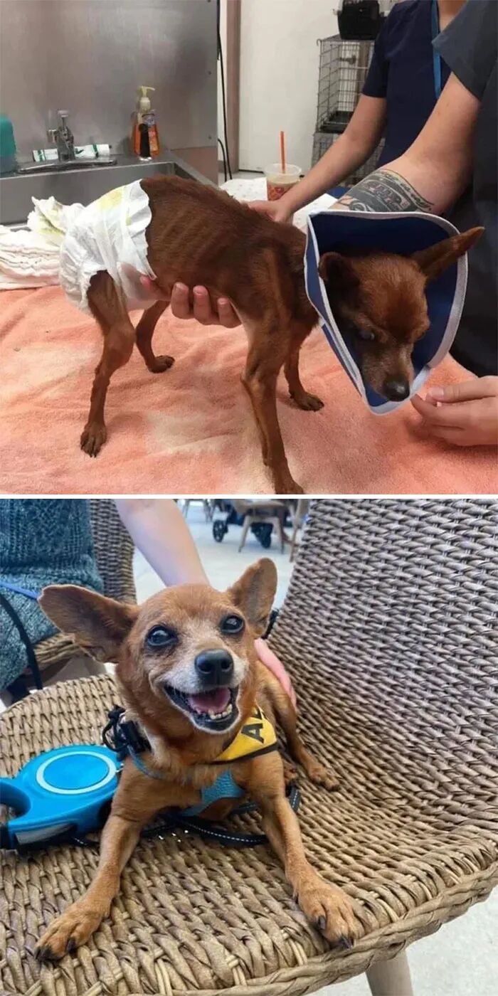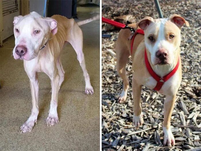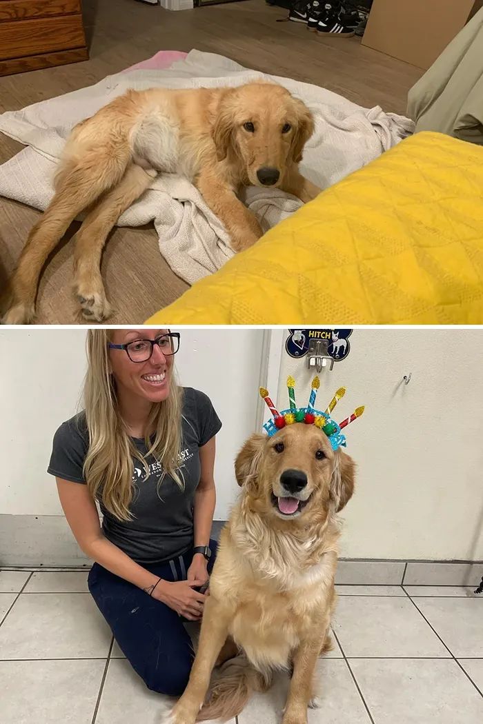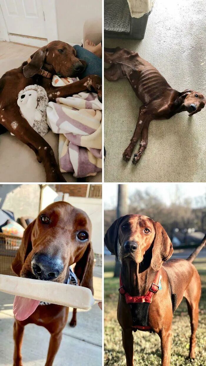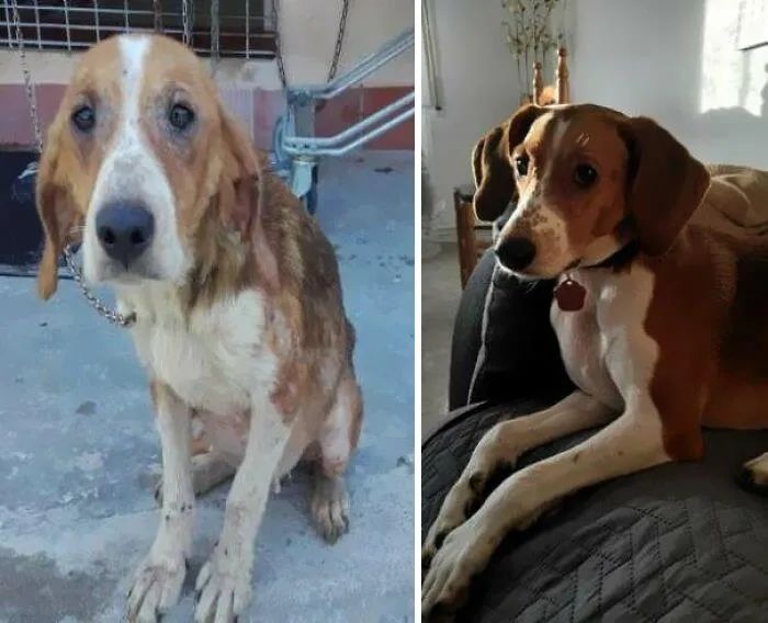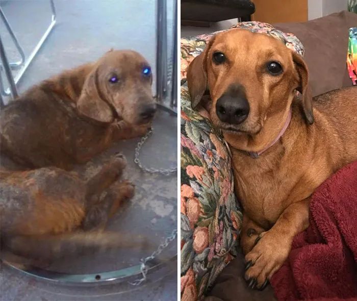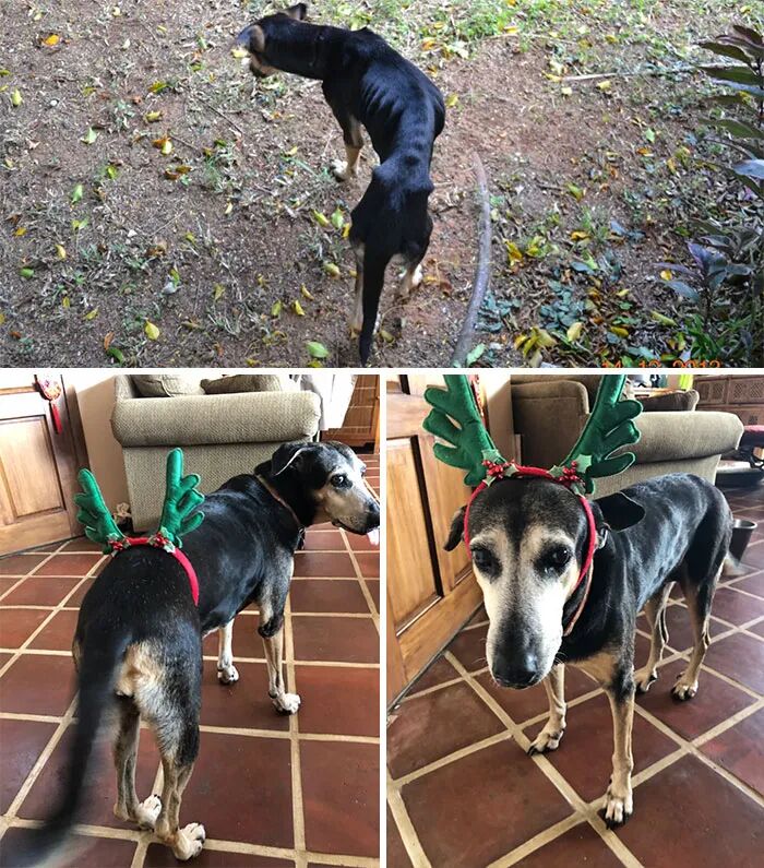 “它到我家的第一天和八年后,皮包骨变成了小驯鹿!”