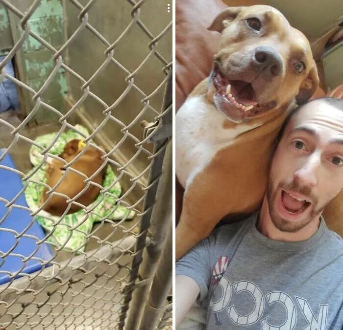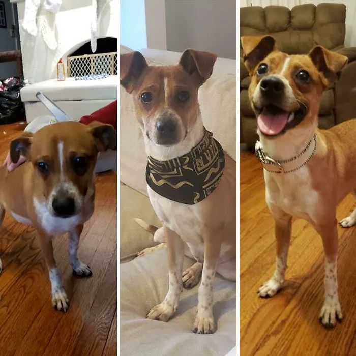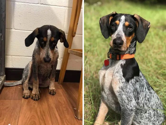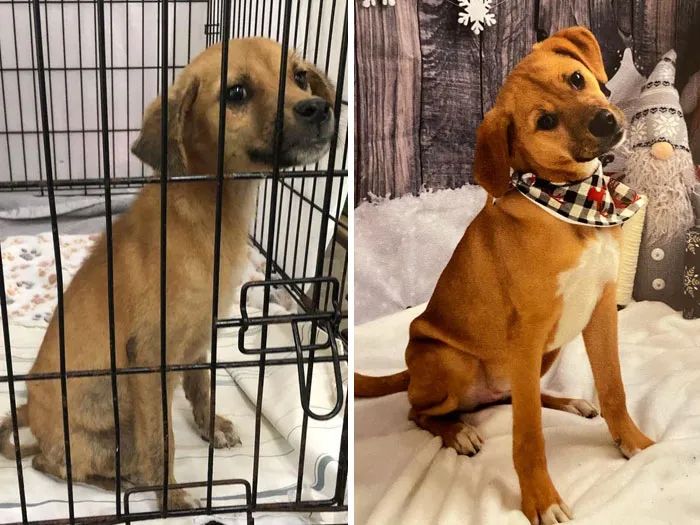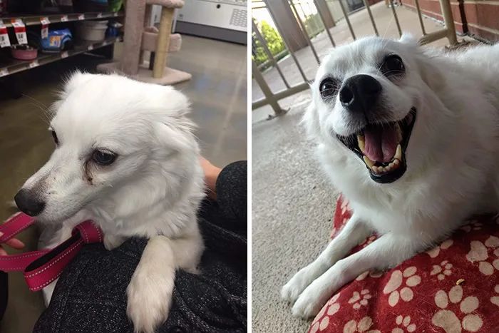 “收容所分享了一只狗狗被领养前后的对比,不是我的狗,我想让你们看看,它浑身发光的样子!”