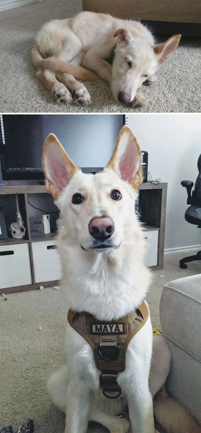 “从一个严重营养不良的瘦弱小狗狗,到健康强壮又阳光帅气的大狗狗,Maya只用了一年。”