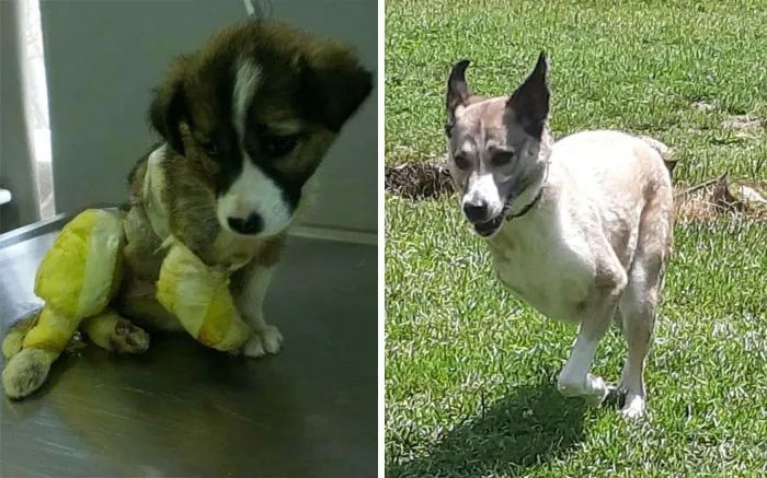 第二张图,是我们带它回家的一年后,它现在非常的健康!”
