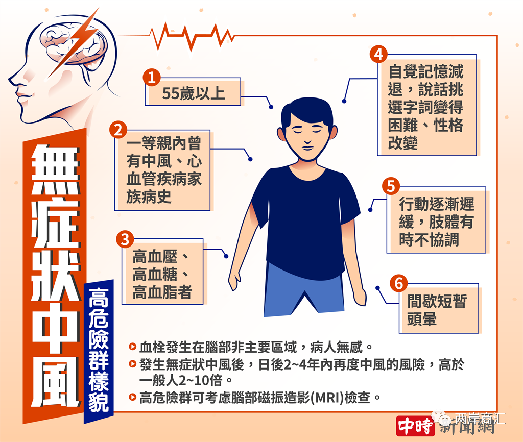 无症状中风虽没有猝死或立即瘫痪的风险,但若长期无视,日后失智、失能或急性中风的机率大增。