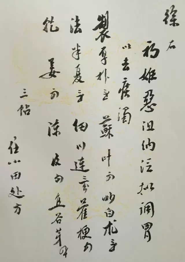 精美的花笺,娟秀的字迹,配以实用的处方,药材间的留白,篆刻的提示语,虽无意安排,却成了章法多变的书法小品,着实耐看。