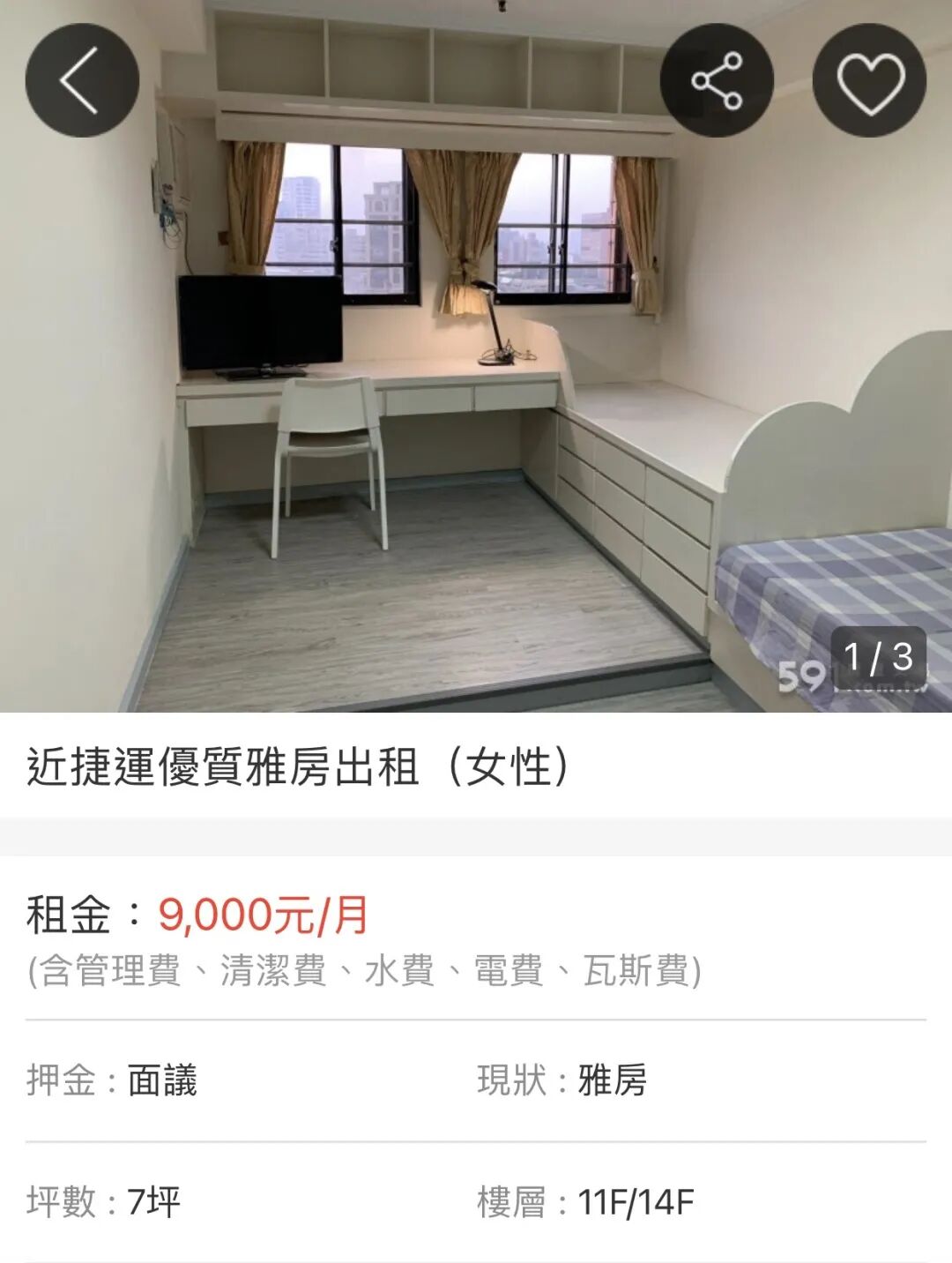 信义区靠近捷运站的地段,二十多平方米的雅房,7000台币/月(1600元人民币/月)可以租到,
