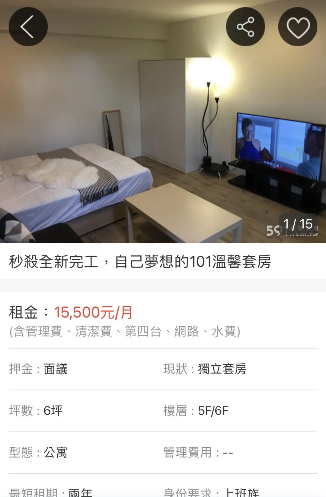 差不多地段和面积的套房则要15500台币/月(3600元人民币/月)。