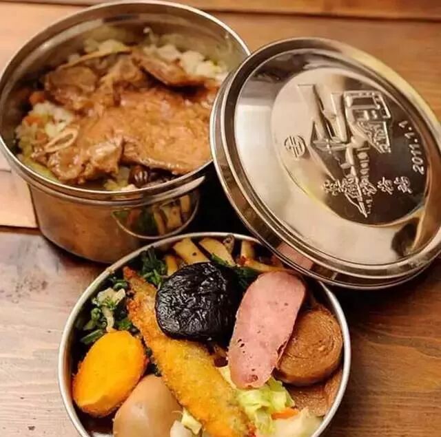 最早便当都是用铁饭盒装的,上面有个“工”字,为了方便带走又有了木制、纸质、竹片的盒子,