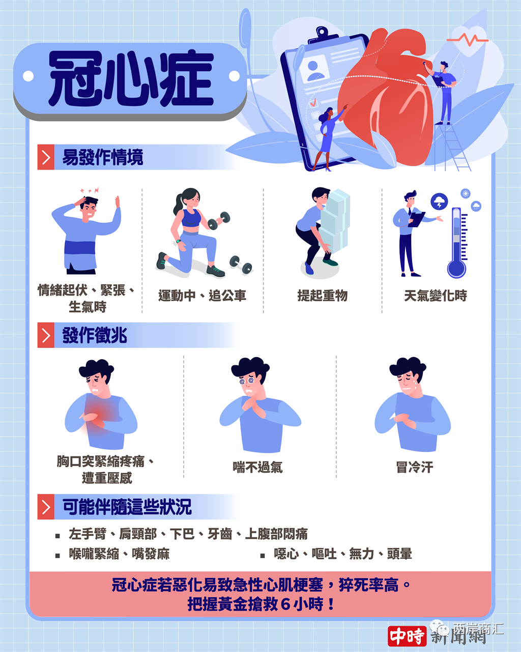 然后休息一下就恢复正常的状态,就要警觉是否已经有冠心症的可能性。」