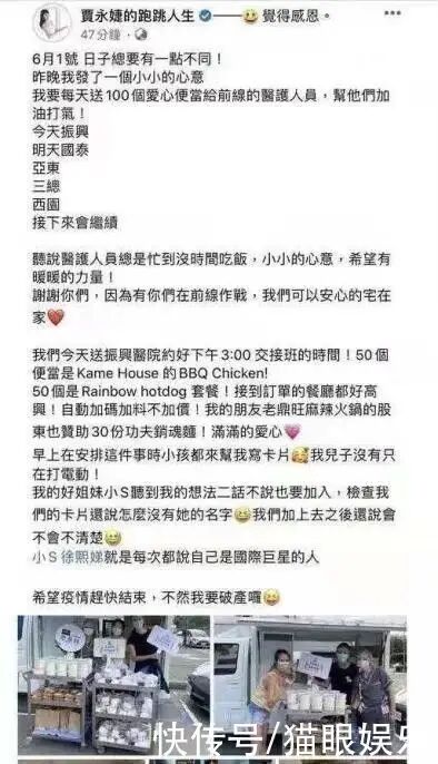 当贾永婕在社交平台发文表示听说医护人员忙碌到没有时间吃饭,