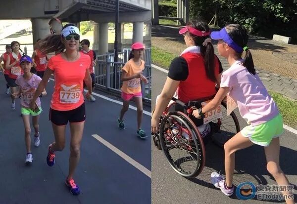 一次比赛到最后3公里处,二女儿小羽和爸爸在路上碰到一名轮椅跑者自己在路中间,看起来有点无助。