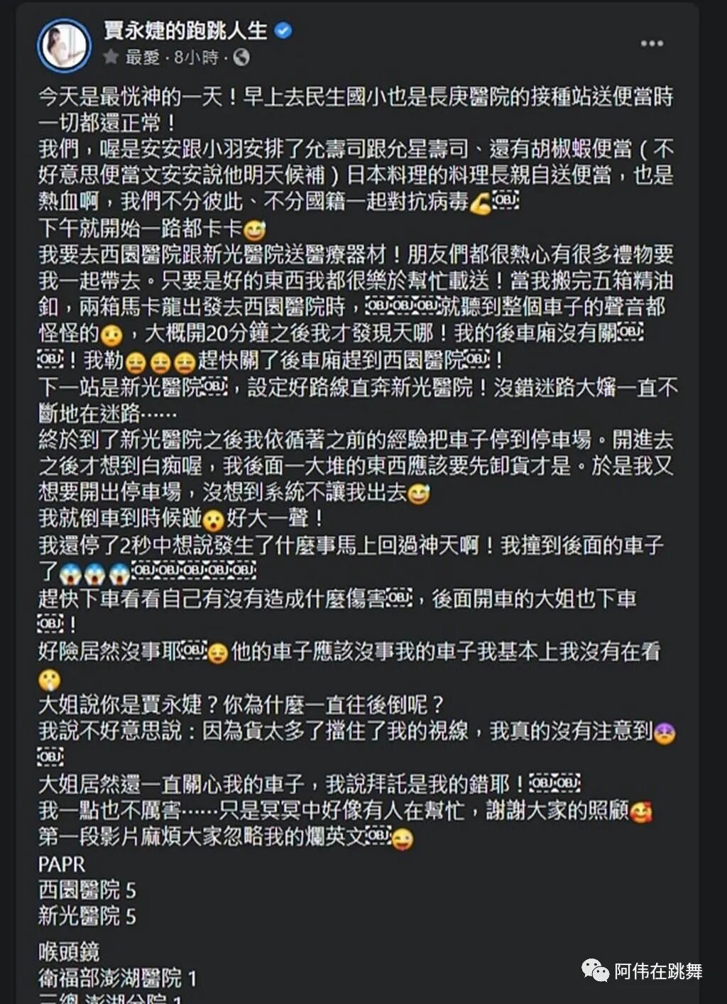 她曾吐露因精力不济,早上去民生国小,也即是长庚病院的接种站送便当时,原来全部都还平常,倒车却出包。
