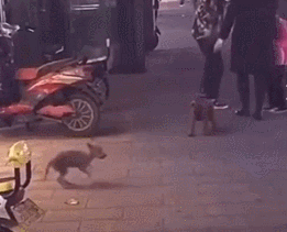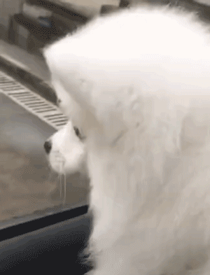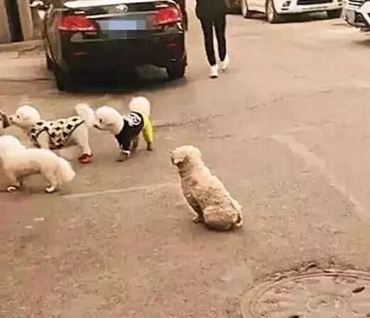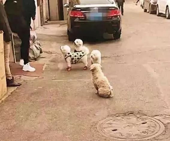 眼巴巴地望着几只穿着衣服的宠物狗……