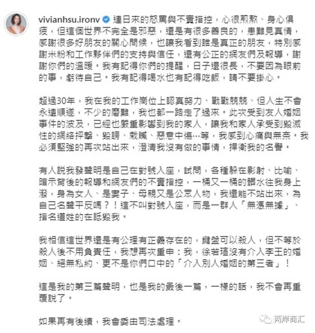 “我,徐若瑄没有介入李王的婚姻、绝无私约,更不是你们口中的‘介入别人婚姻的第三者’”。