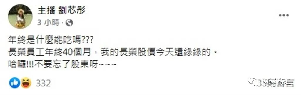 财经网美胡采苹也在脸书粉丝页PO文“各大企业请学学,赚钱发员工天经地义,赚钱发股东福寿绵延。感恩赞叹。”