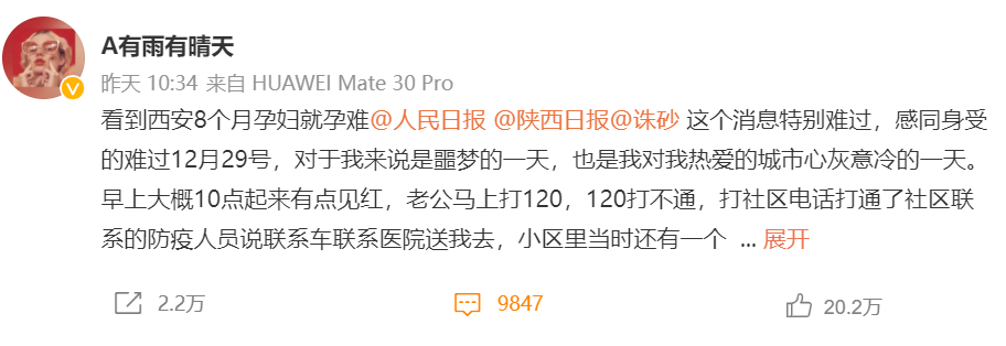 1月5日早上,西安市另一位经历怀孕流产的王女士(微博ID“A有雨有晴天”)看到孕妇流产的信息后,