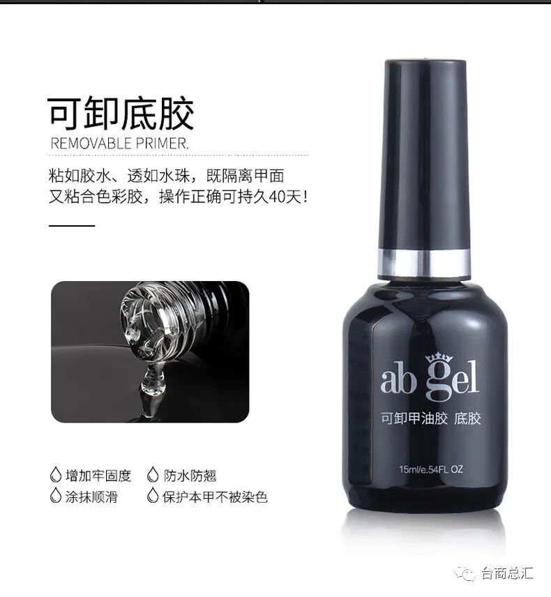可卸底胶:粘如胶水、透如水珠,既隔离甲面又粘合色彩胶,