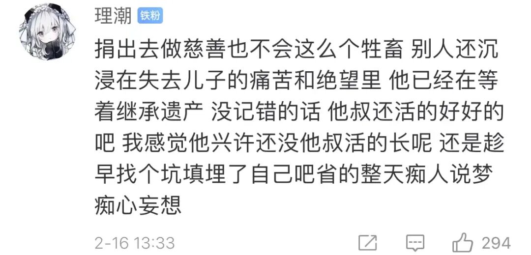“捐出去做慈善也不会给这么个牲畜。别人还沉浸在失去儿子的痛苦和绝望里,他已经在等着继承遗产。