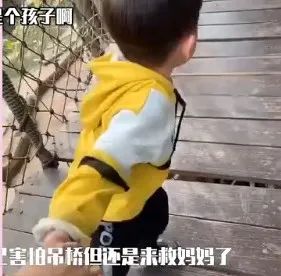 走路还走不稳的小弟弟,虽然自己也害怕吊桥,却更怕妈妈掉下去,就勇敢地走过吊桥来牵妈妈回去。