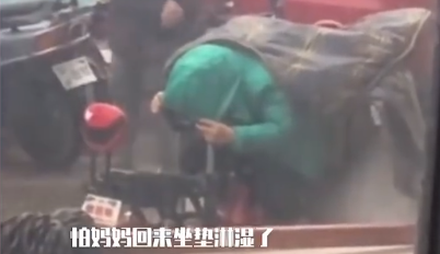 下雨天,一个戴着兜帽的小弟弟,害怕妈妈的电动车坐垫湿了,就趴在那里遮雨。
