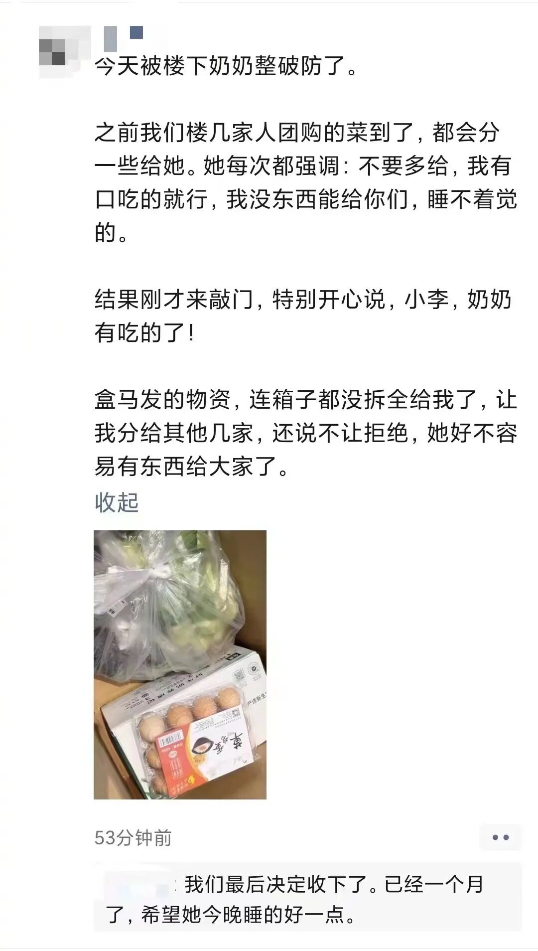 还有这位因为别人的帮助而睡不着觉的老奶奶。每次收到别人分给自己的菜,都会强调: