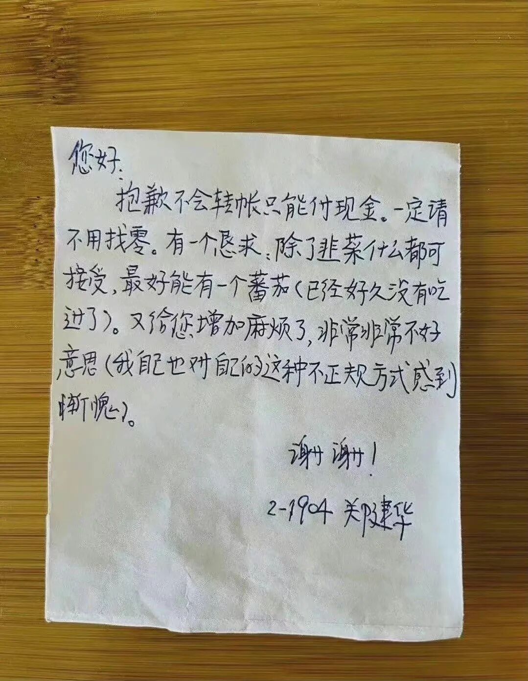比如这位手写字条,恳请负责采购的志愿者帮他带个番茄的老爷爷: