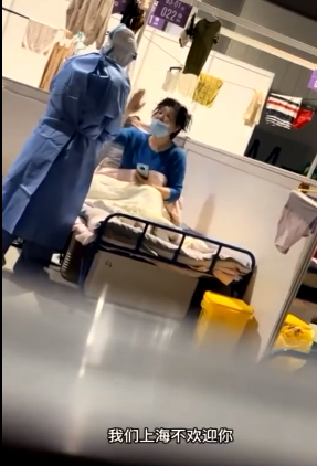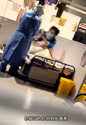 一位上海老太太半坐在床上,对着外地过来援护的医护人员恶语相向: