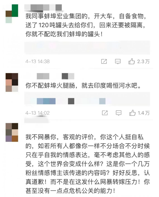 “我同事蚌埠宏业集团的,开大车,自备食物,送了120吨罐头去给你们,回来还要被隔离,你就不配吃我们蚌埠的罐头!”