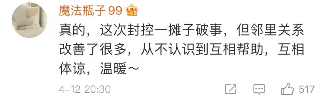 “真的,这次封控一摊子破事,但邻里关系改善了很多,从不认识到互相帮助,互相体谅,温暖~”