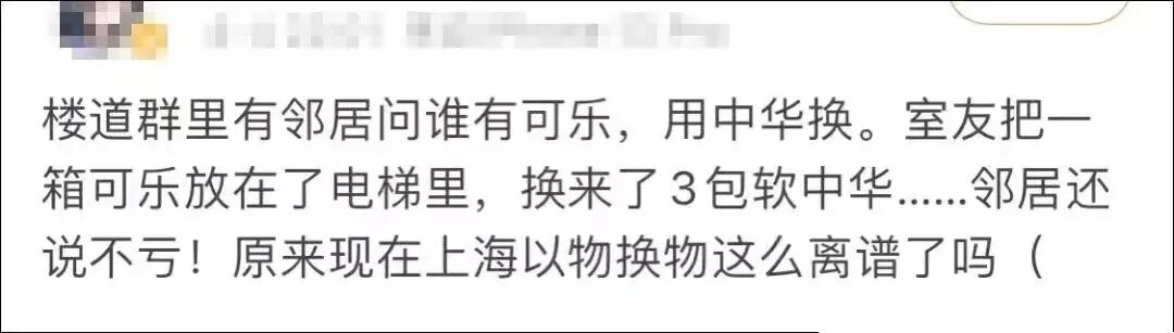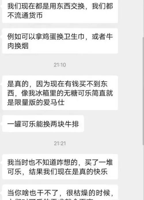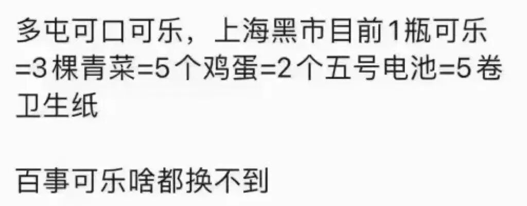 有上海本地人出来现身说法:“现在有钱买不到东西,像我冰箱里的无糖可乐简直就是限量版的爱马仕,一罐可乐能换两块牛排。”
