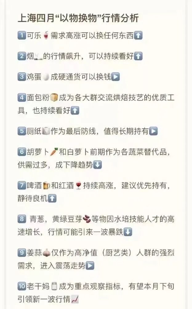 更有1张“上海4月以物换物行情分析表”流传于朋友圈,上面赫然显示: