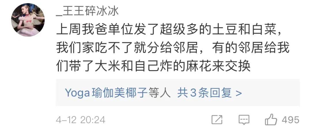 “上周我爸单位发了超级多的土豆和白菜,我们家吃不了就分给邻居,有的邻居给我们带了大米和自己炸的麻花来交换。”