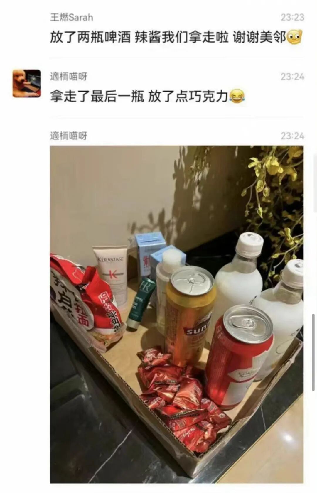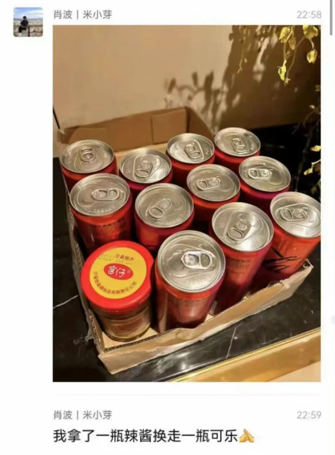 几分钟后,有邻居真的去拿了一罐可乐,但她也不是白拿,而是用一瓶辣酱换的: