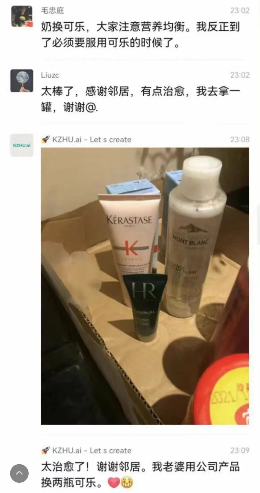 “太治愈了!谢谢邻居。我老婆用公司产品换两瓶可乐。”