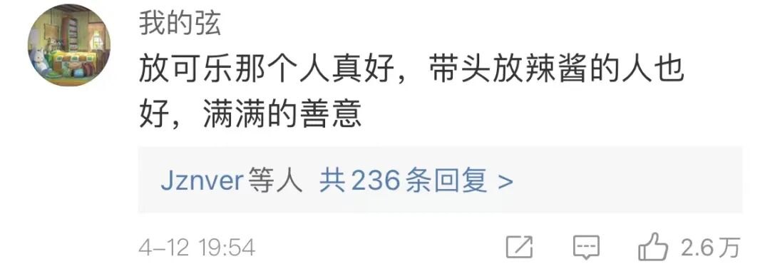 “放可乐那个人真好,带头放辣酱的人也好,满满的善意。”