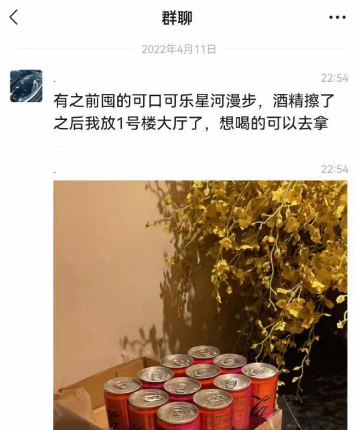“有之前囤的可口可乐星河漫步,酒精擦了之后我放1号楼大厅了,想喝的可以去拿。”