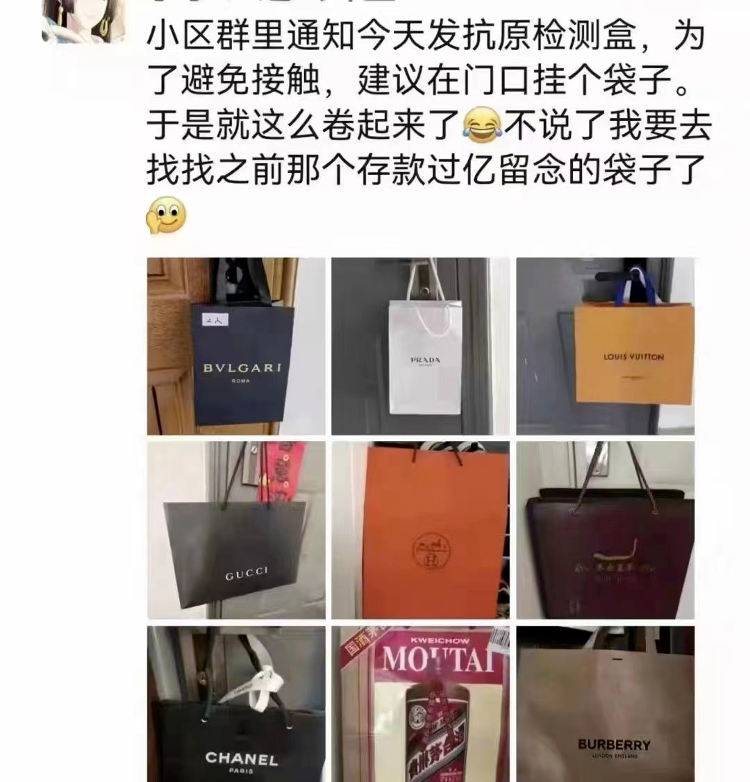 比如,上海人在门口挂的装抗原检测盒的袋子,都是奢侈品名牌包装袋: