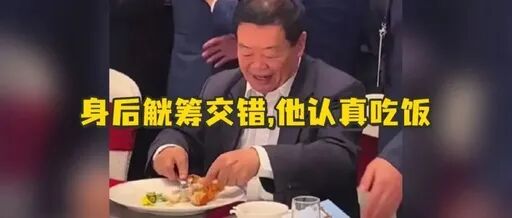 身后觥筹交错,他的注意力却只在眼前的一盘饭菜上,认认真真地品尝美食。