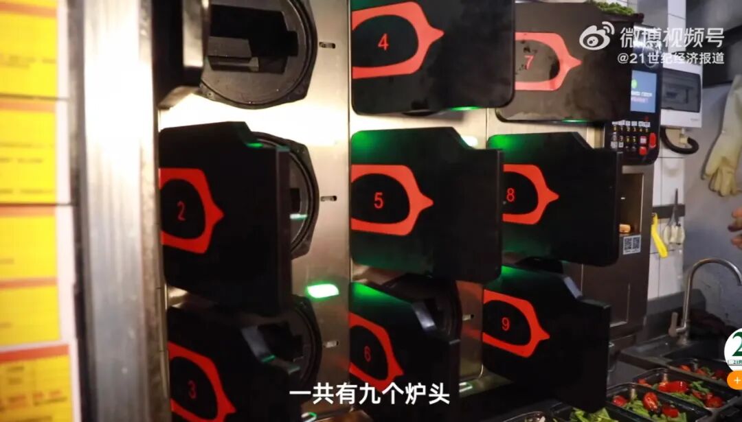 另外一种是智能机器人,一共有9个炉头,一次性可以出9份菜。
