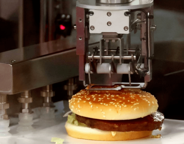 加热面包、煎肉饼、配生菜和酱汁、包装,只需要20秒,一个新鲜热乎的汉堡就能出炉。