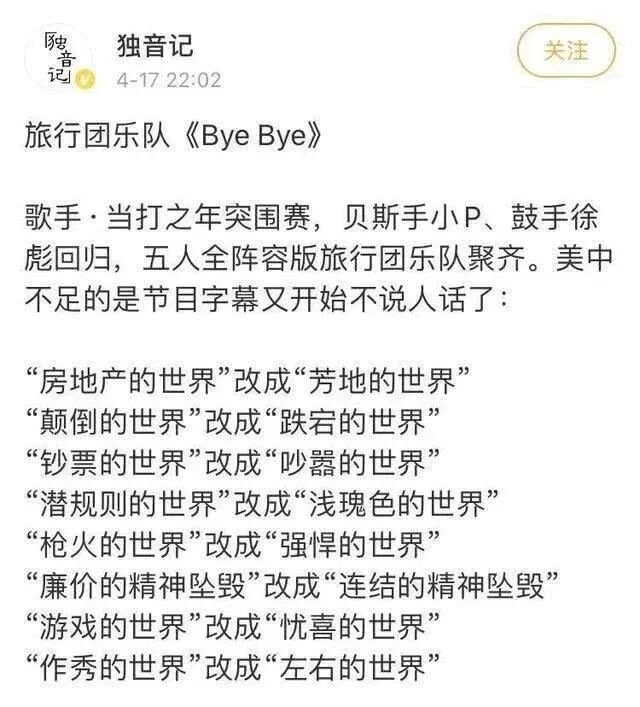 《大事发声》里,朴树唱的一句“那些东西大麻不能给你”,被改成了“大妈不能给你”。