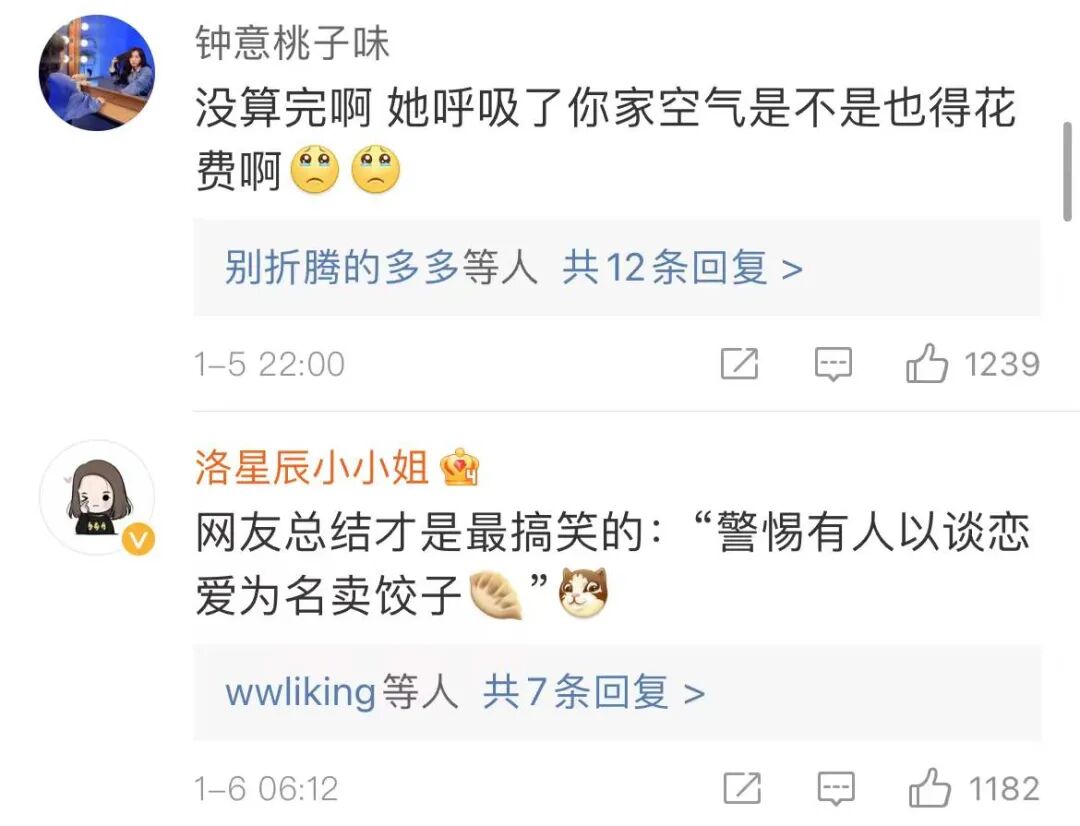 “网友总结才是最搞笑的:警惕有人以谈恋爱为名卖饺子。”
