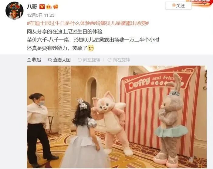 另一边是在迪士尼里办生日宴的富家小公主,玲娜贝儿星黛露出场费半个小时一万二,围着小公主拍手又跳舞。