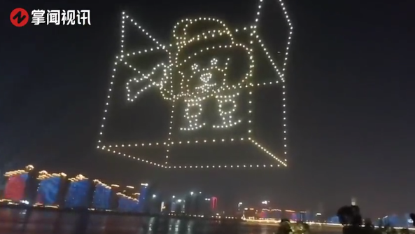 湖南长沙,夜空中突然升起了520架无人机,变换一只戴帽子的小狗形象。