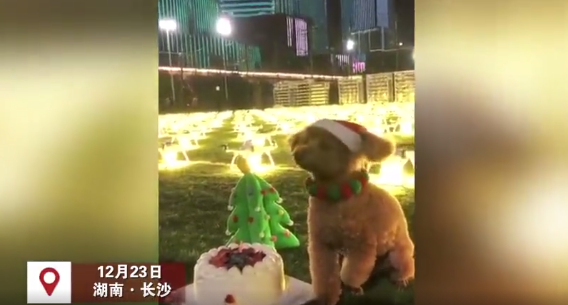 女孩为豆豆准备了蛋糕,给它戴上圣诞帽,还约上了几个朋友,围着豆豆一起唱生日快乐歌。