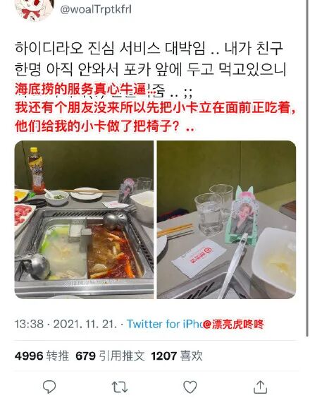 她感慨:“海底捞的服务真心牛逼。我有个朋友还没来,所以先把小卡立在面前正吃着。
