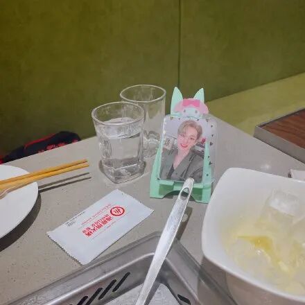 配图是火锅旁边,一张爱豆的照片被贴心地放在一个手机支架上。