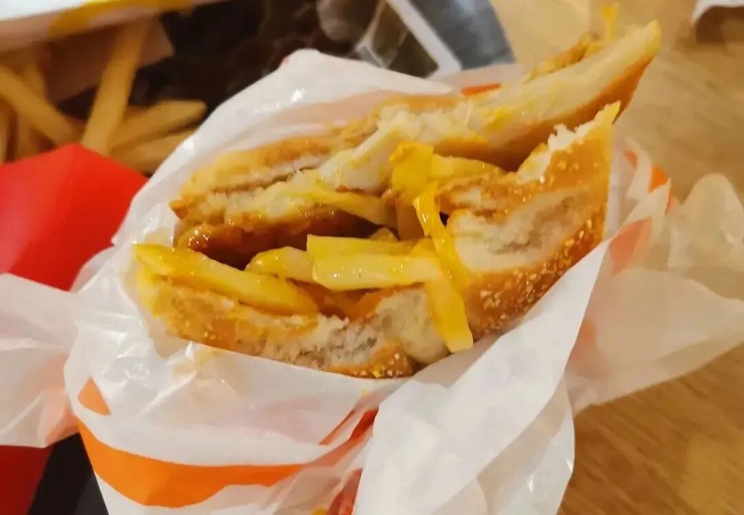 只见一个年轻的小姐姐,左手举着可乐,右手拿着汉堡正在大快朵颐。