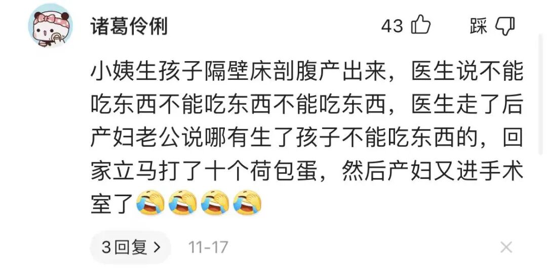 “小姨生孩子,隔壁床剖腹产出来,医生一再强调不能吃东西。
