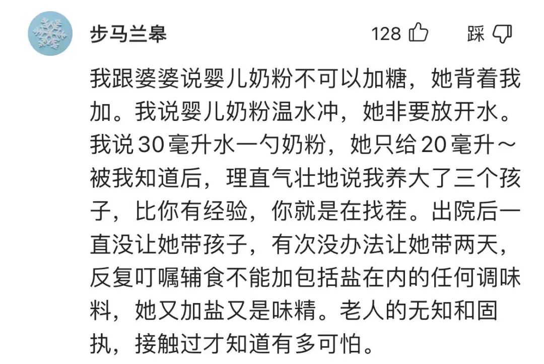 “我跟婆婆说婴儿奶粉不可以加糖,她背着我加。我说婴儿奶粉温水冲,她非要放开水。
