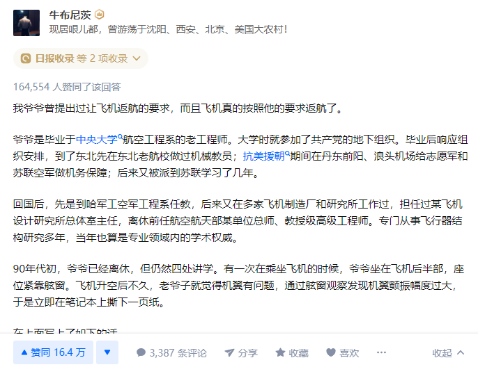 答主“牛布尼茨”说,他爷爷曾跟空姐提出过让飞机返航的要求,而且飞机真的按照他的要求返航了。