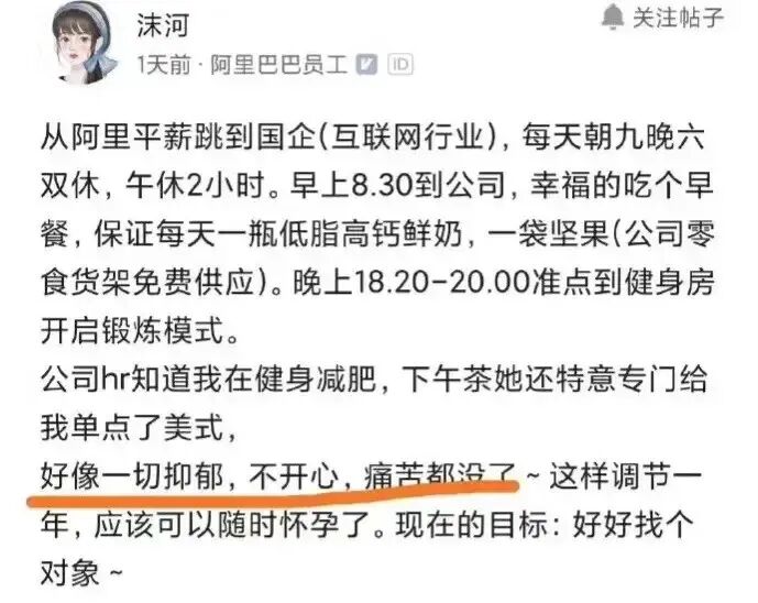 她说:从阿里平薪跳到国企,每天朝九晚六双休,午休2小时。